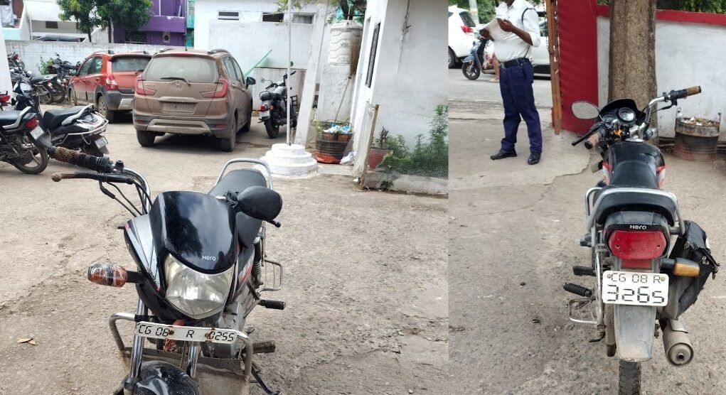 लाउड हेलर से आवाज लगाने पर एक व्यक्ति वहां पहुंचा, जिसने अपना नाम लोकेश कुमार, निवासी डोंगरगढ़ बताया। जब उससे वाहन हटाने को कहा गया, तो पुलिसकर्मियों की नजर बाइक की नंबर प्लेट पर गई। बाइक के आगे की नंबर प्लेट में CG 08 R 0255 लिखा था, जबकि पीछे की नंबर प्लेट में CG 08 R 3265 अंकित था। यानी एक ही वाहन पर दो अलग-अलग नंबर, जो साफ तौर पर धोखाधड़ी की ओर इशारा करता है।