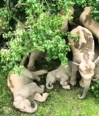 कटघोरा वनमंडल में 52 हाथियों का झुंड मौजूद, शावकों संग आराम फरमाते मोहक नजारा कैमरे में कैद