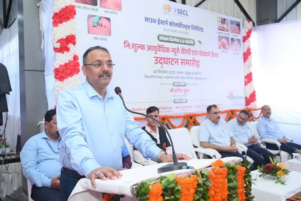 बिलासपुर। एसईसीएल सीएमडी हरीश दुहन के निर्देशन में स्वच्छता ही सेवा 2025 अभियान के अंतर्गत प्रियदर्शिनी क्लब, इंदिरा विहार कॉलोनी, बिलासपुर में निःशुल्क आयुर्वेदिक न्यूरोथेरेपी एवं पंचकर्म कैम्प का शुभारंभ किया गया। इस कार्यक्रम का उद्घाटन 26 सितंबर को मुख्य अतिथि निदेशक (मानव संसाधन) बिरंची दास ने किया। इस अवसर पर डॉ. श्रुतिदेव मिश्रा, डॉ. महेन्द्र रघुवंशी, महाप्रबंधक श्यामला राव, महाप्रबंधक (सीएसआर) सी.एम. वर्मा, उप महाप्रबंधक मनीष वास्तव और अन्य अधिकारी मौजूद रहे।