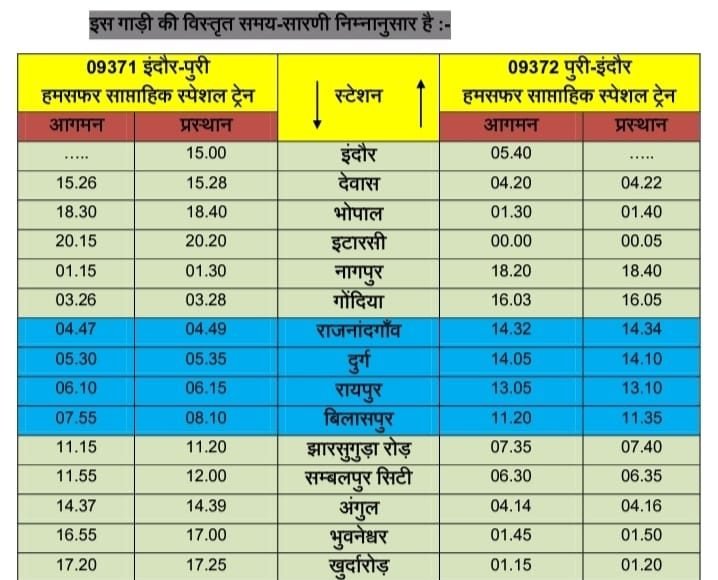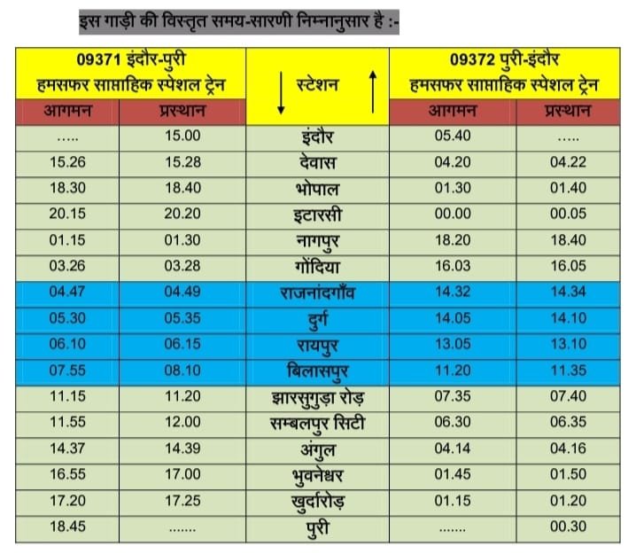 इसी प्रकार गाड़ी संख्या 09372 पुरी-इंदौर हमसफर साप्ताहिक स्पेशल प्रत्येक गुरुवार को पुरी से रात 00.30 बजे रवाना होगी तथा दक्षिण पूर्व मध्य रेलवे के ठहराव वाले बिलासपुर स्टेशन में आगमन सुबह 11.20 बजे तथा प्रस्थान 11.35 बजे होगा।  रायपुर स्टेशन में आगमन 13.05 बजे व प्रस्थान 13.10 बजे, दुर्ग स्टेशन में आगमन 14.05 बजे प्रस्थान 14.10 बजे, राजनांदगांव में आगमन 14.32 बजे प्रस्थान 14.34 बजे, गोंदिया में आगमन 16.03 बजे प्रस्थान 16.05 बजे होगा। यह ट्रेन अगले दिन सुबह  05.40 बजे इंदौर पहुंचेगी।