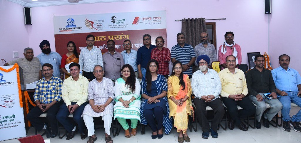 बिलासपुर। विश्व रंग कार्यक्रम के तहत पुस्तक यात्रा के समापन और युवा उत्सव के प्रारंभ के अवसर पर वनमाली सृजन पीठ बिलासपुर में कहानी और कविता पाठ का आयोजन किया गया। इस अवसर पर देश के कोने कोने से आए रचनाकारों ने अपनी रचना का पाठ किया। इस अवसर पर संख्या में साहित्य प्रेमी और विवि के विभागों के विभाग के अध्यक्ष उपस्थित थे।