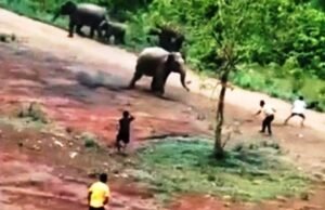 ग्रामीणों के पथराव से आक्रामक हुए सड़क पार कर रहे हाथी,...