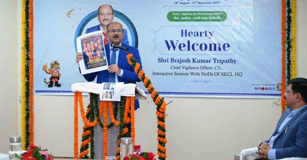 बिलासपुर। कोल इंडिया लिमिटेड के मुख्य सतर्कता अधिकारी (CVO) ब्रजेश कुमार त्रिपाठी अपने दो दिवसीय दौरे पर सोमवार को बिलासपुर स्थित एसईसीएल मुख्यालय पहुंचे। इस अवसर पर उन्होंने एसईसीएल के अधिकारियों और कर्मचारियों को सतर्कता विषय पर विशेष व्याख्यान दिया और संगठन में ईमानदारी, पारदर्शिता तथा नैतिक आचरण की संस्कृति को सशक्त बनाने का आह्वान किया।