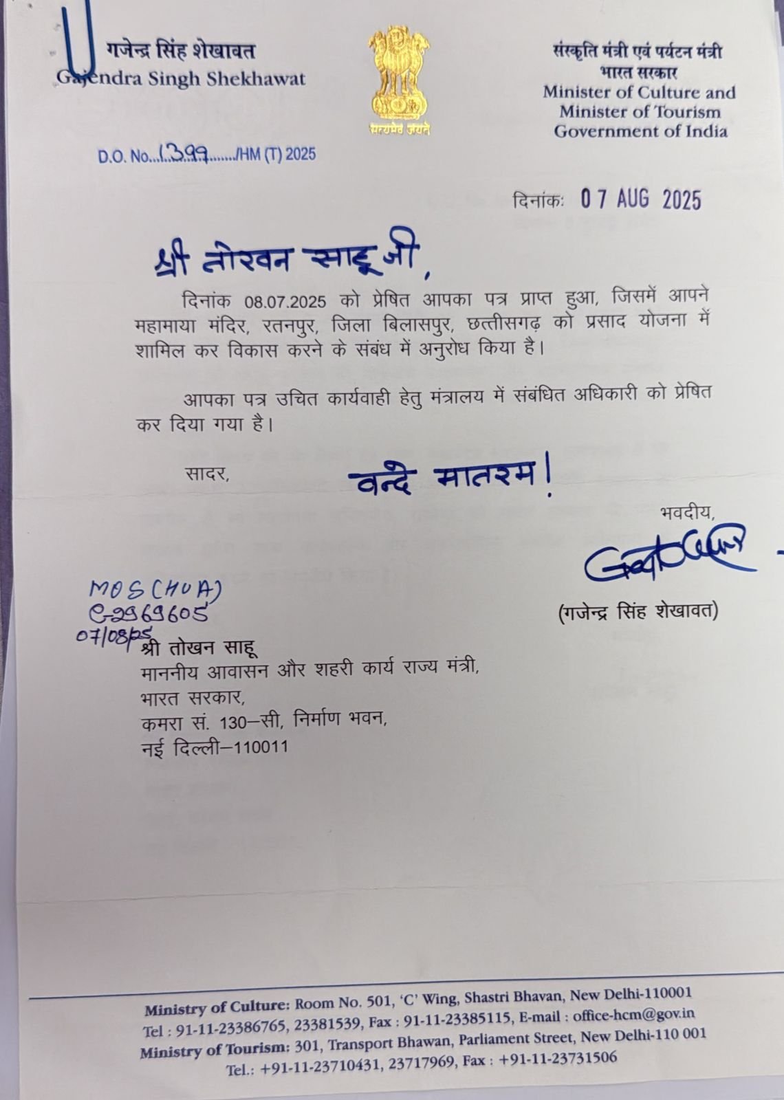 केंद्रीय पर्यटन मंत्री गजेन्द्र सिंह शेखावत ने इस प्रस्ताव पर सकारात्मक कदम उठाते हुए 7 अगस्त 2025 को पत्र के माध्यम से सूचित किया कि यह अनुरोध संबंधित अधिकारी को आगे की कार्रवाई के लिए भेज दिया गया है।